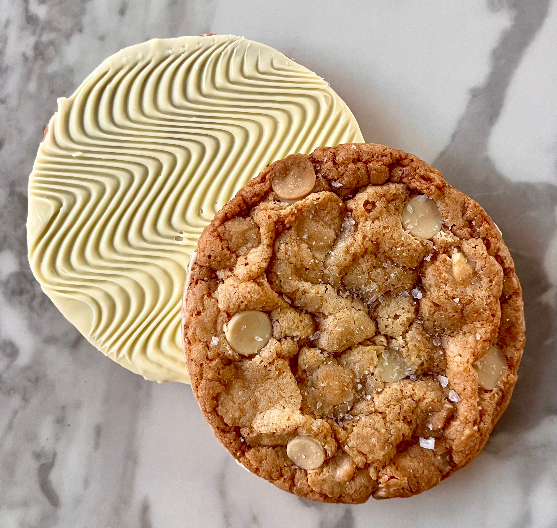 A delicate twist on a classic — our 4-pack of artisan white chocolate chip cookies feature creamy white chocolate chips and finished with a decorative dip of smooth tempered white chocolate on the underside.